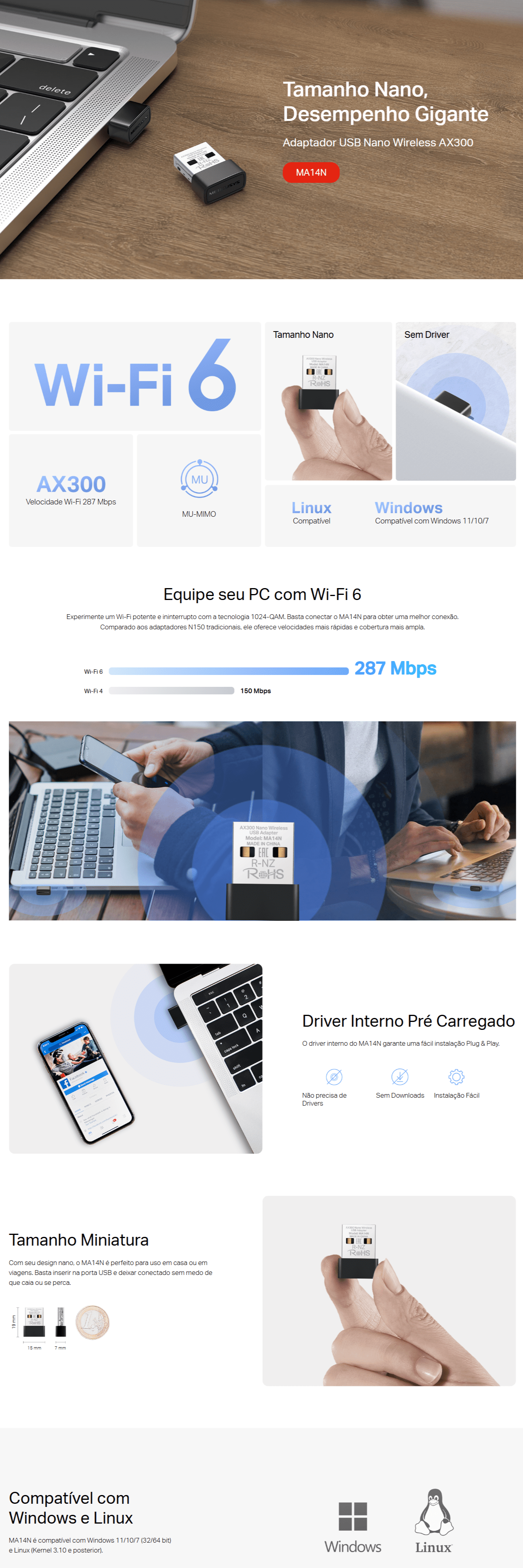 Driver interno pré-carregado para uma rápida instalação. O MA14N da Mercusys é totalmente Plug & Play. 2