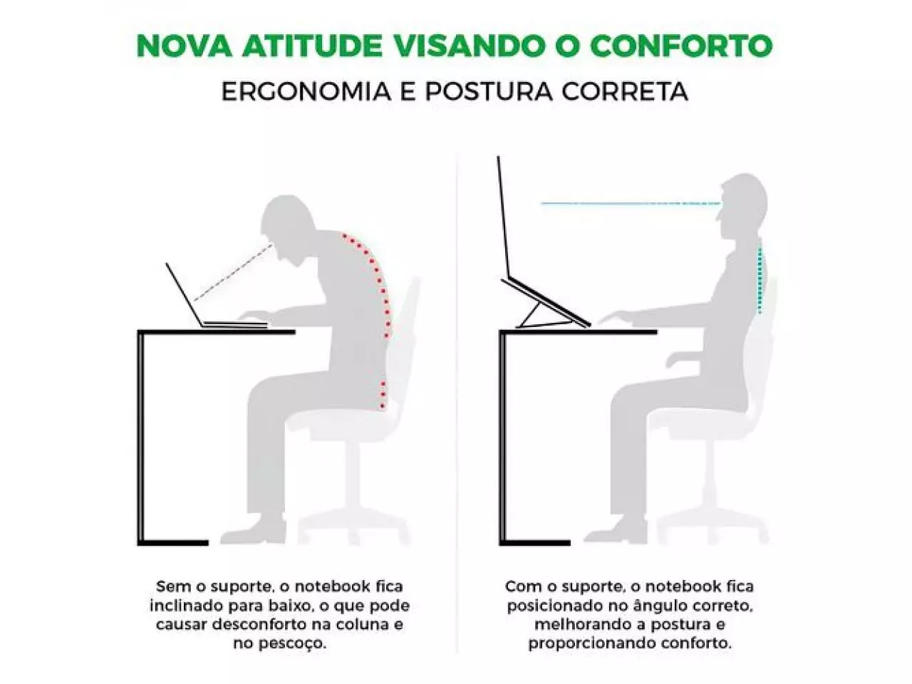 - Melhora a ergonomia e postura ao utilizar o notebook, preste atenção a tensão muscular e dores no pescoço, costas e mãos.