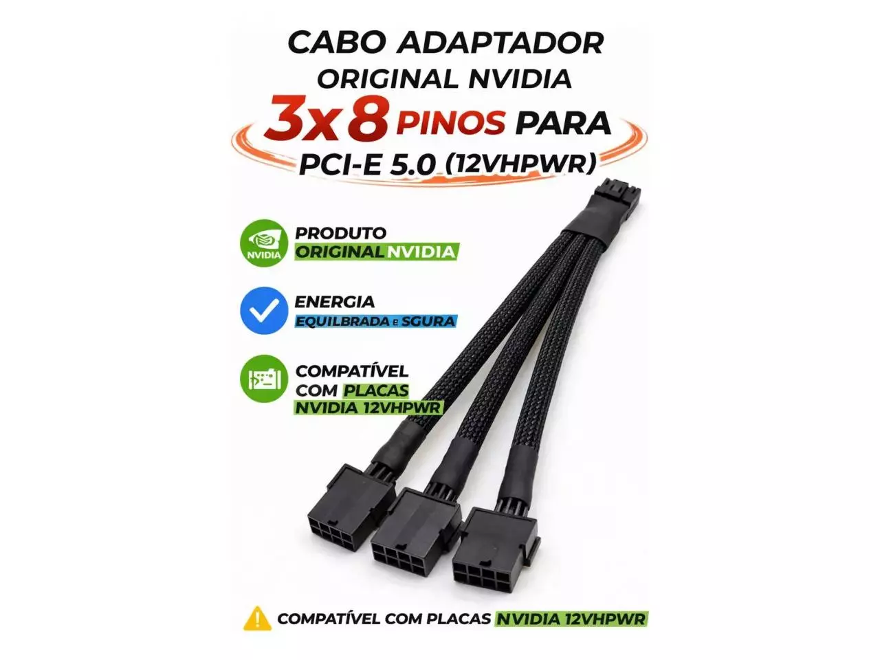 O cabo adaptador original NVIDIA 3x 8 pinos para PCI-Express 5.0 foi desenvolvido para fornecer energia estável, segura e eficiente a placas de vídeo NVIDIA de alto desempenho equipadas com conector 12VHPWR. Produto original de fábrica, garantindo compatibilidade total e máxima confiabilidade para sua GPU.