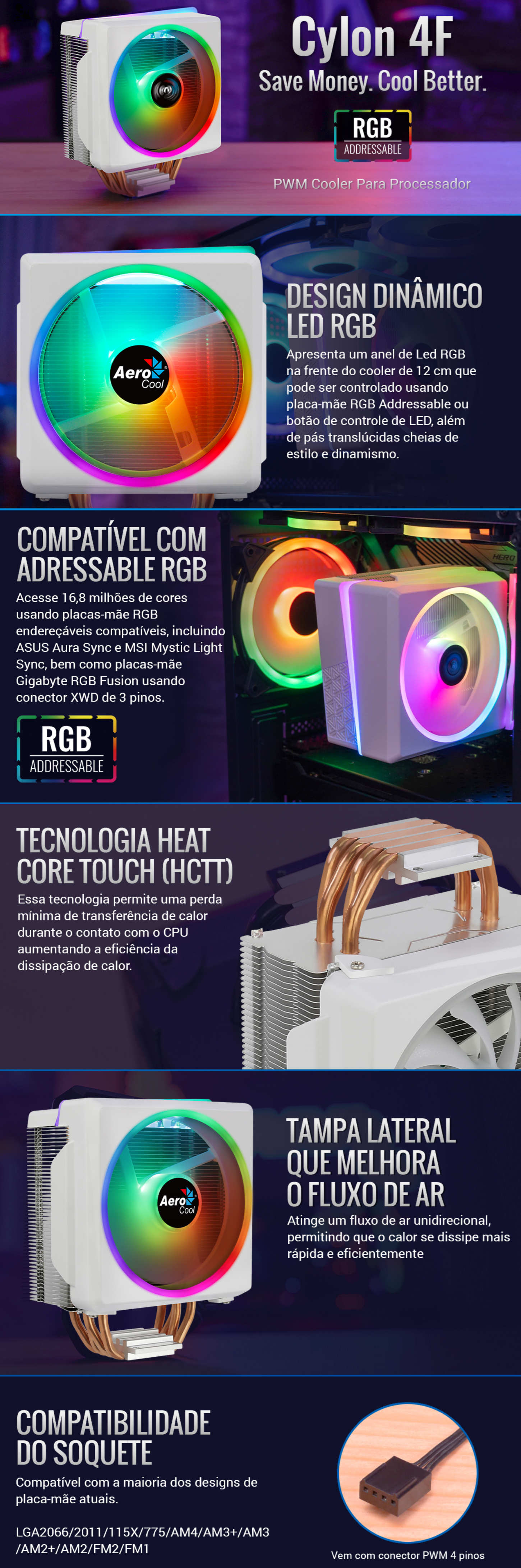 O Cooler Para Processador Aerocool Cylon 4F é uma solução de refrigeração de ar PWM com LED RGB endereçável elegante na parte frontal e lateral do refrigerador de ar. Alimentado por tecnologia Heat Core Touch (HCTT) com 4 tubos de calor ultra-eficientes. O revestimento preto nas aletas aumenta a área de dissipação de calor e melhora a eficiência da dissipação. A tampa lateral do refrigerador de ar permite um fluxo de ar unidirecional, melhorando a dissipação de calor. Vem equipado com ventoinha RGB endereçável de 12 cm com pás translúcidas que podem ser controladas usando placa-mãe RGB endereçável ou botão de controle LED.