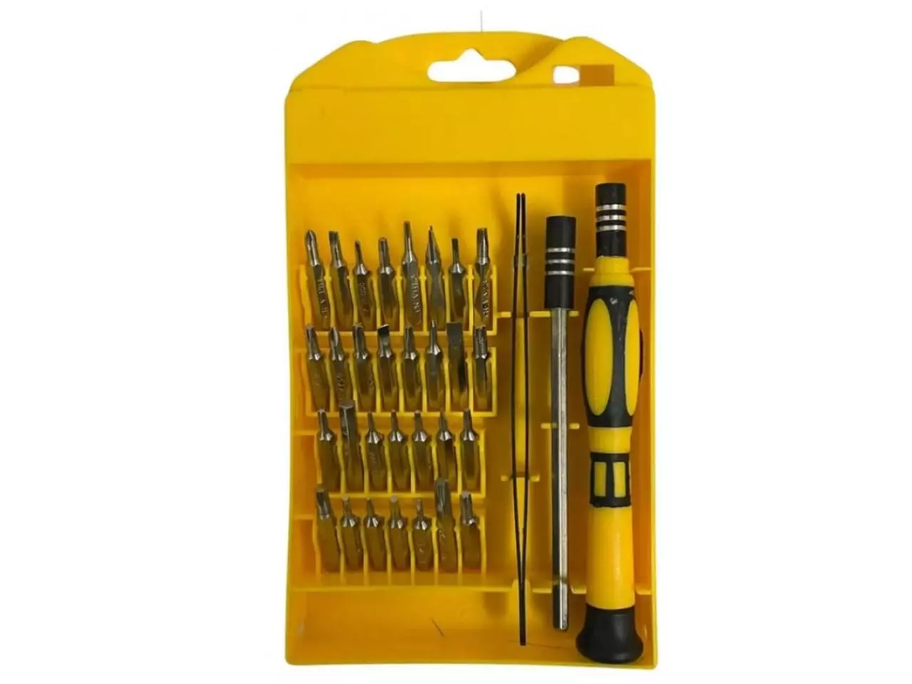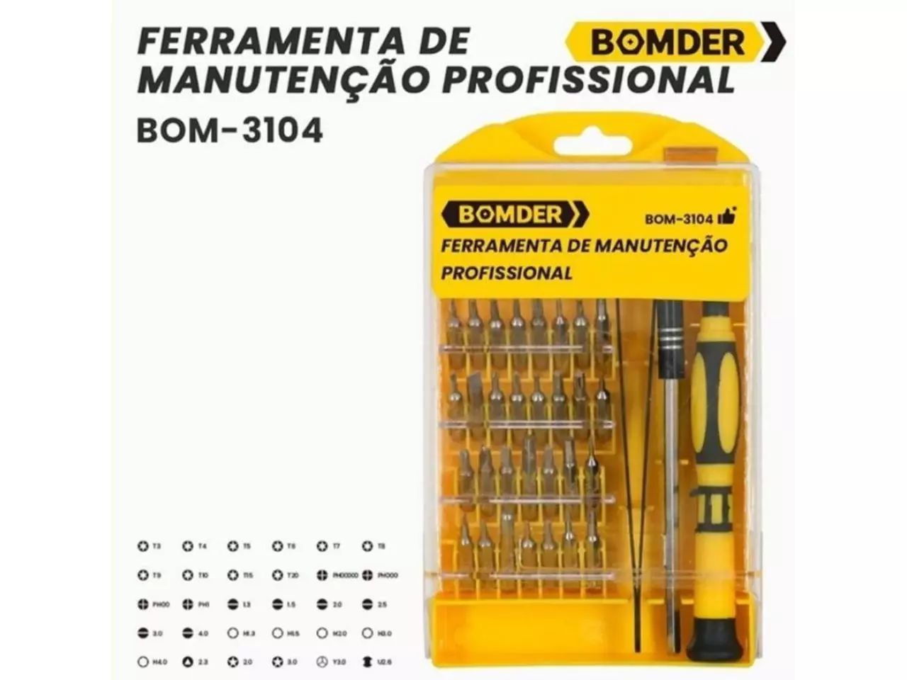 Kit de chave para manutenção profissional 33 em 1 Chave Phillips Fenda Com ímã Bom-3104 - BomVink O Kit Jogo De Ferramentas 33 em 1 Chave Phillips Fenda Com ímã é uma ferramenta indispensável para qualquer profissional ou entusiasta do bricolage. Este kit é da marca BOMDER, conhecida pela sua qualidade e durabilidade. O kit inclui um estojo com 30 pontas imantadas de alta qualidade e precisão, todas niqueladas para maior durabilidade. Além disso, o kit vem com um cabo giratório, um extensor de 60mm, uma pinça e um estojo acrílico para armazenagem.