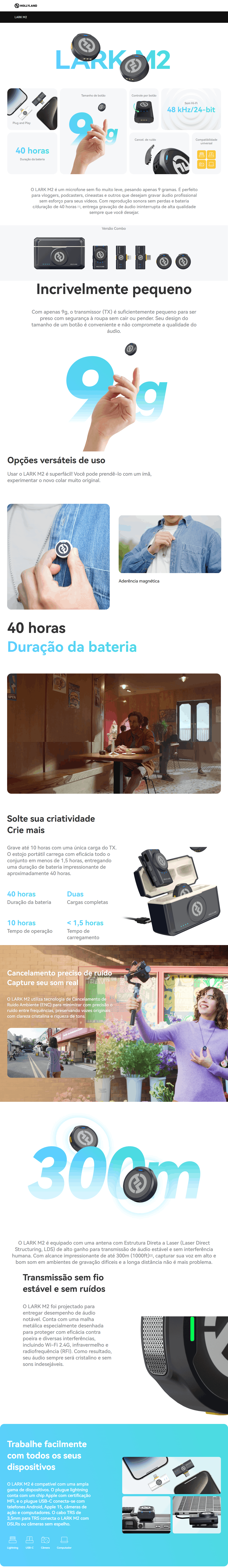O Hollyland Lark M2 Combo é a solução ideal para quem busca qualidade de áudio profissional, praticidade e versatilidade em gravações. Perfeito para criadores de conteúdo, produção de vídeos, entrevistas e uso profissional, oferecendo excelente desempenho, confiabilidade e ótimo custo-benefício.