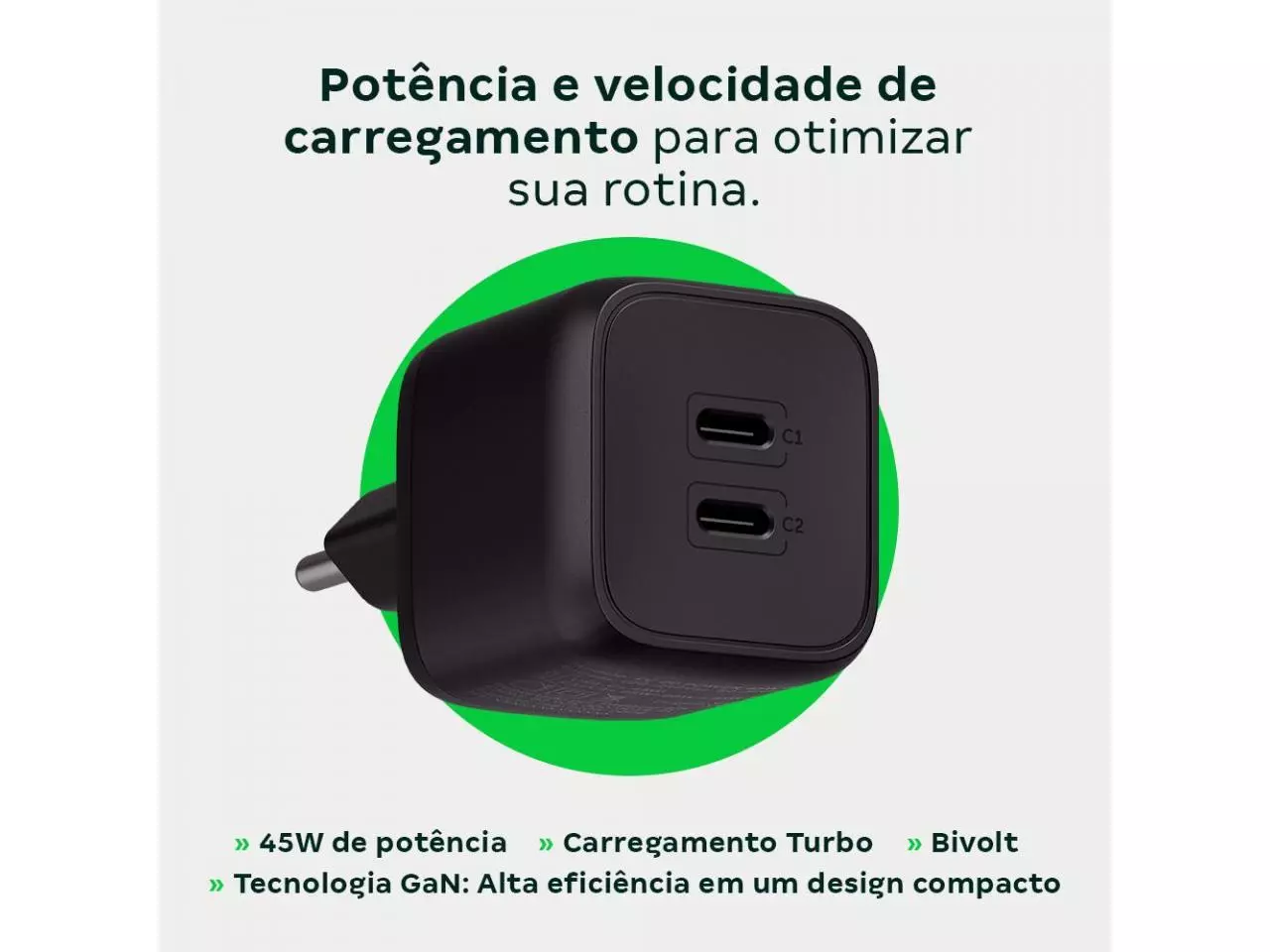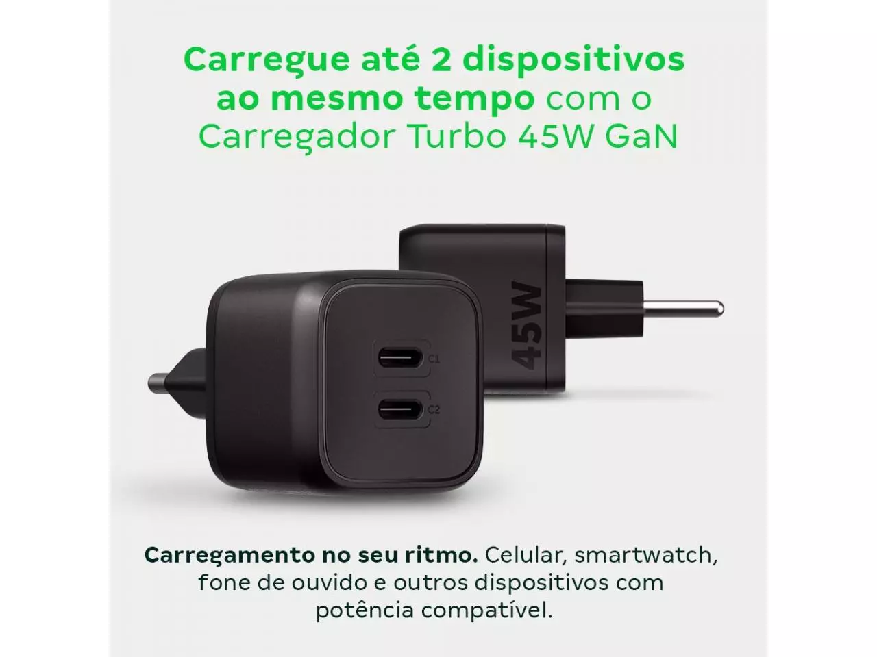 O EC 20 Power 45W é um carregador USB ultrarrápido e versátil, com 2 saídas USB, no formato USB-C, oferecendo flexibilidade para atender os mais diferentes tipos de dispositivos, dos mais novos aos mais antigos. Com saída USB-C Power Delivery (USB-C PD) com potência máxima de 45 W (PD), ele carrega os aparelhos compatíveis em até três vezes mais rápido* que um carregador convencional. *a tensão e corrente de saída podem variar de acordo com o dispositivo conectado e cabo utilizado.