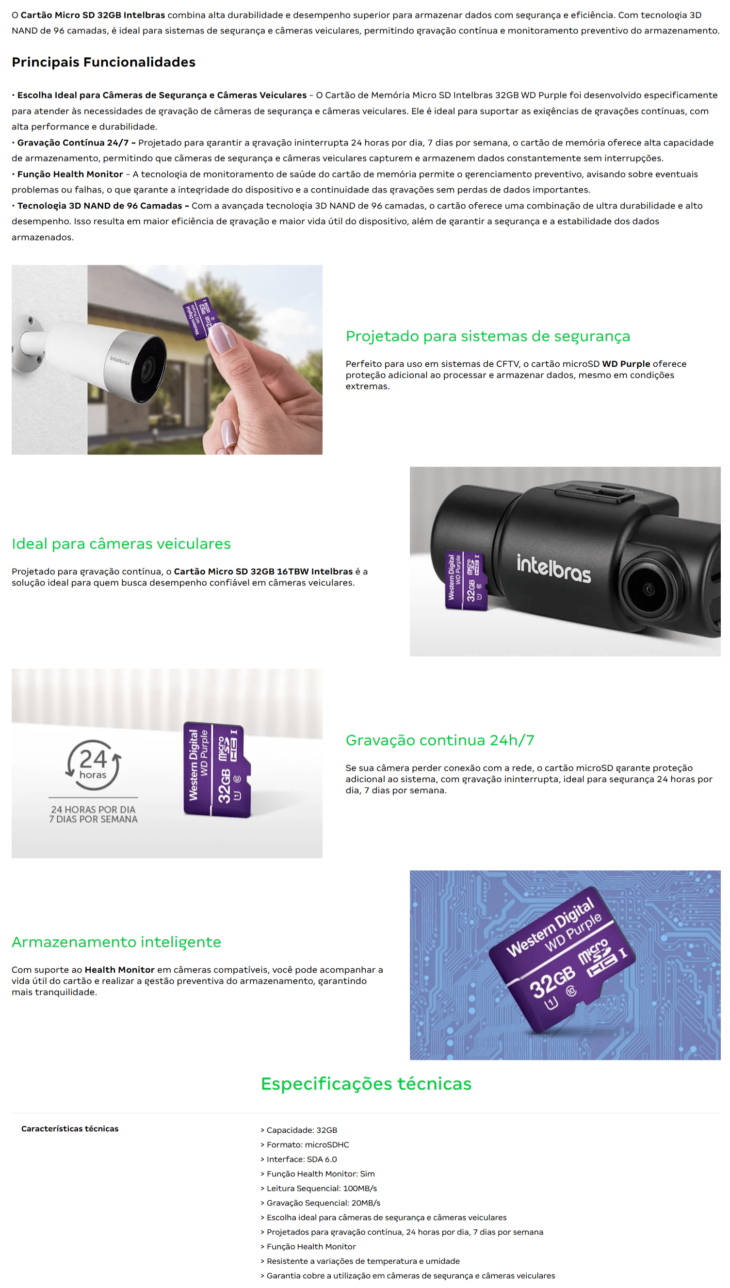 • Escolha Ideal para Câmeras de Segurança e Câmeras Veiculares - O Cartão de Memória Micro SD Intelbras 32GB WD Purple foi desenvolvido especificamente para atender às necessidades de gravação de câmeras de segurança e câmeras veiculares. Ele é ideal para suportar as exigências de gravações contínuas, com alta performance e durabilidade.