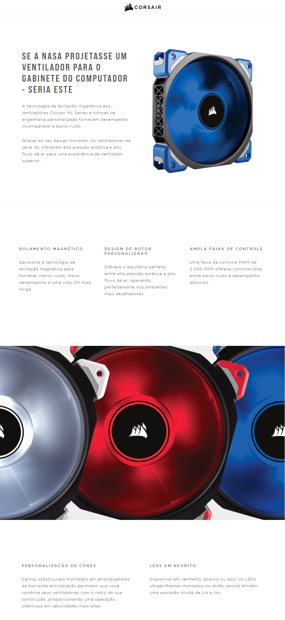 CORSAIR ML120 PRO LED oferece desempenho e silêncio incomparáveis, utilizando tecnologia de levitação magnética e design de rotor personalizado. O design inovador oferece alta pressão estática e alto fluxo de ar.