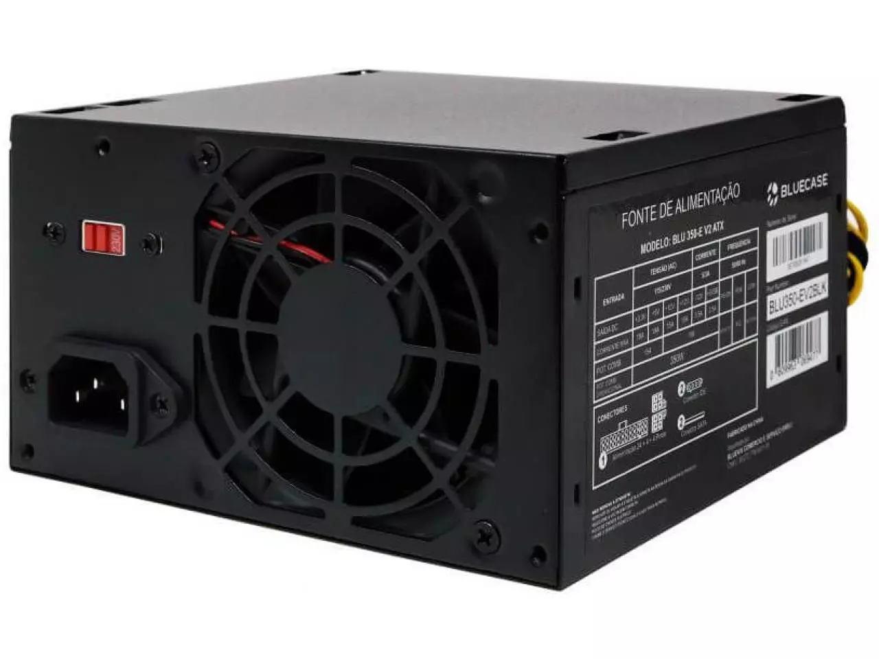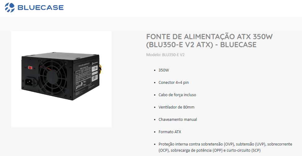 A Fonte de alimentação Bluecase® BLU350-E V2 é o modelo que conta com 350W de potência máxima da linha Bluecase® e é indicado para configurações de entrada ou para uso em escritório, em máquinas que demandam uso moderado de energia. A fonte possui chaveamento manual 110V ~ 220V e já acompanha cabo de força no padrão brasileiro NBR 14136 de 10A. Conta também com ventilador de 80mm silencioso, para facilitar a ventilação, toda a sua estrutura é na cor preta e possui proteções de sobretensão (OVP), subtensão (UVP), sobrecorrente (OCP), sobrecarga de potência (OPP) e curto-circuito (SCP).