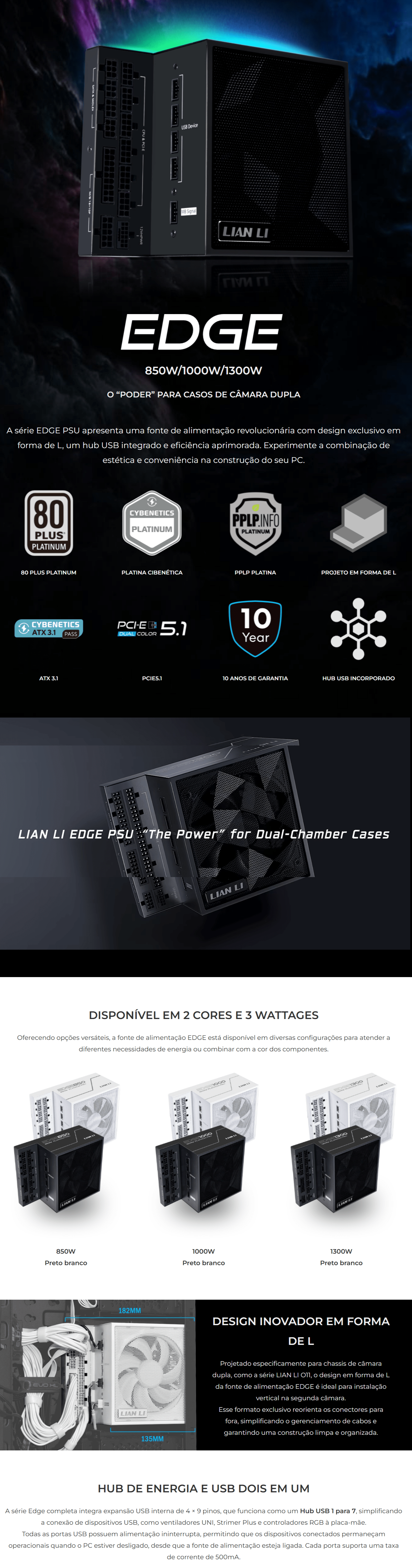 A série EDGE PSU apresenta uma fonte de alimentação revolucionária com design exclusivo em forma de L, um hub USB integrado e eficiência aprimorada. Experimente a combinação de estética e conveniência na construção do seu PC.