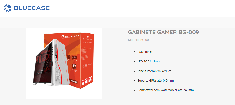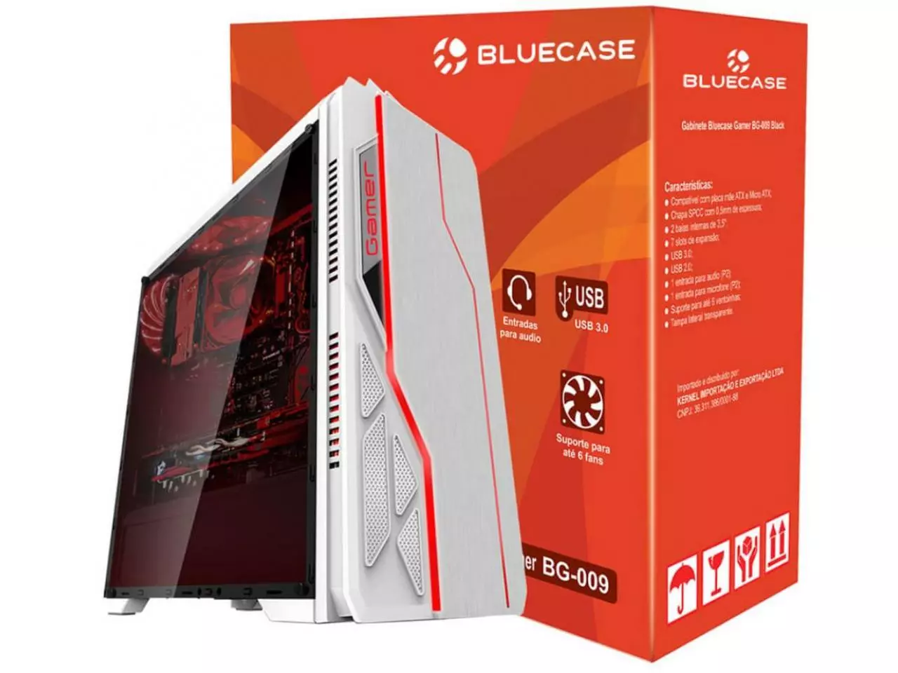 O gabinete Bluecase® BG-009 também conta com uma janela lateral em acrílico, permitindo ao usuário explorar o design e cores de todo o seu hardware. Também é compatível com Watercoolers de até 240mm e placa de vídeo de até 340mm, você irá encontrar o gabinete Bluecase® BG-009 disponível nas cores preto ou branco.