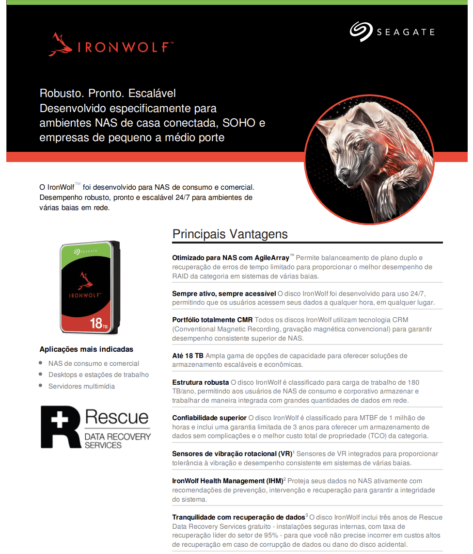 A Seagate entende os seus desafios exclusivos relacionados ao armazenamento de dados. Com os discos rígidos IronWolf® para NAS (network attached storage) ficará mais fácil você atingir os seus objetivos. Continuamos ampliando os limites de capacidade muito além da concorrência.Para todos os aspectos do NAS, há o IronWolf, sempre ligado, sempre trabalhando. Desenvolvidos para ambientes multiusuários e altas taxas de carga de trabalho, esses discos rígidos para NAS são aprimorados com a tecnologia AgileArray™ para garantir confiabilidade e escalabilidade de sistema otimizados.