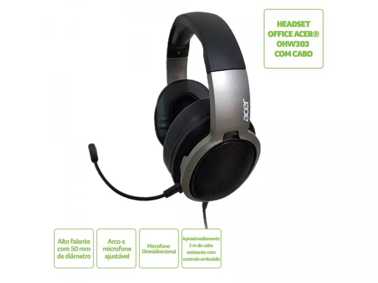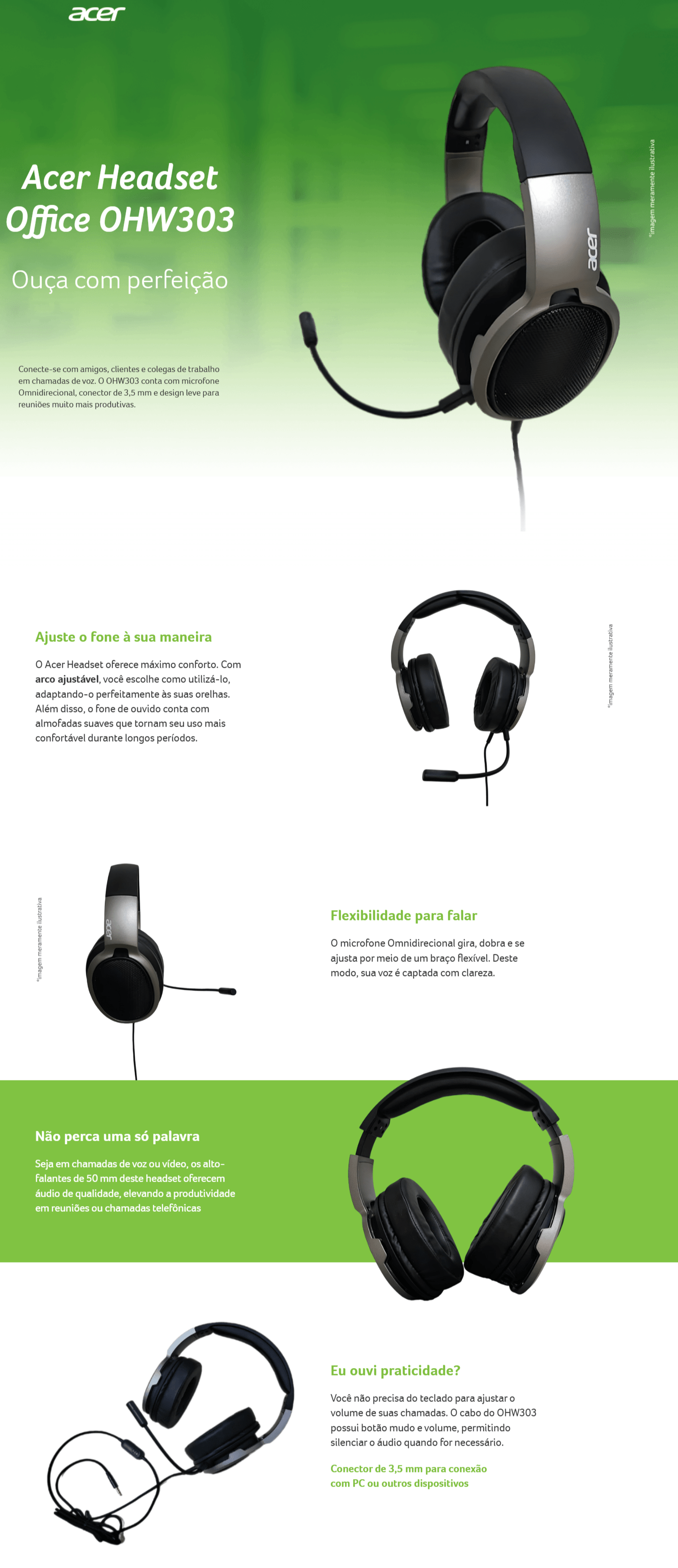 O Acer Headset oferece máximo conforto. Com arco ajustável, você escolhe como utilizá-lo, adaptando-o perfeitamente às suas orelhas. Além disso, o fone de ouvido conta com almofadas suaves que tornam seu uso mais confortável durante longos períodos.