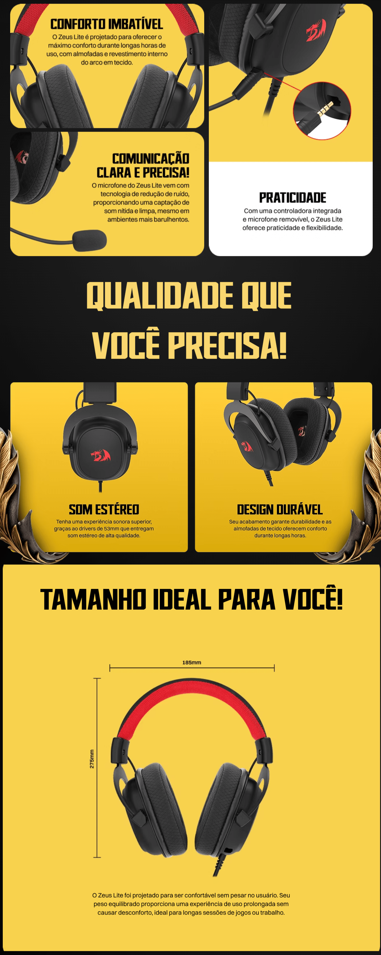 O headset Zeus Lite oferece som de 53mm, microfone com redução de ruído e design confortável. Conta com microfone removível e controladora integrada para mais praticidade.