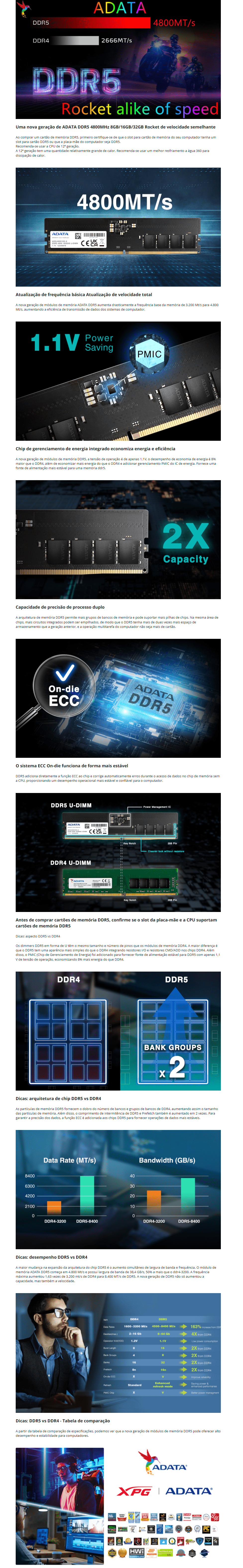 A nova geração de módulos de memória ADATA DDR5 aumenta drasticamente a frequência base da memória de 3.200 Mt/s para 4.800 Mt/s, aumentando a eficiência de transmissão de dados dos sistemas de computador.