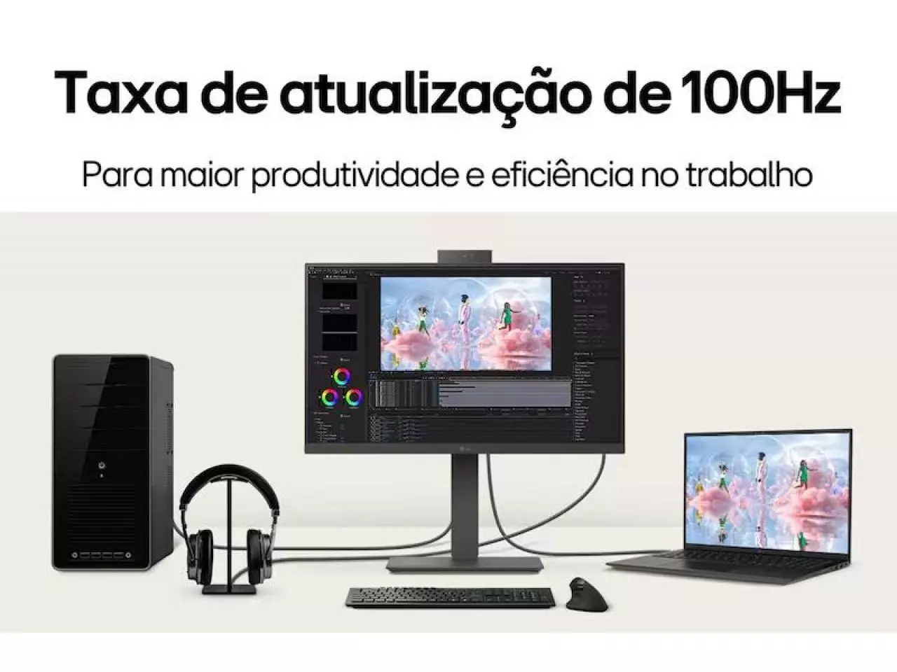 O LG 24BA850-B é um monitor profissional de 24 polegadas desenvolvido para quem busca produtividade, conectividade e conforto no ambiente de trabalho. Com painel IPS Full HD, taxa de atualização de 100Hz, cobertura de sRGB 99% e diversos recursos integrados, ele entrega excelente qualidade de imagem, fluidez no uso diário e praticidade para escritórios, home office e ambientes corporativos.