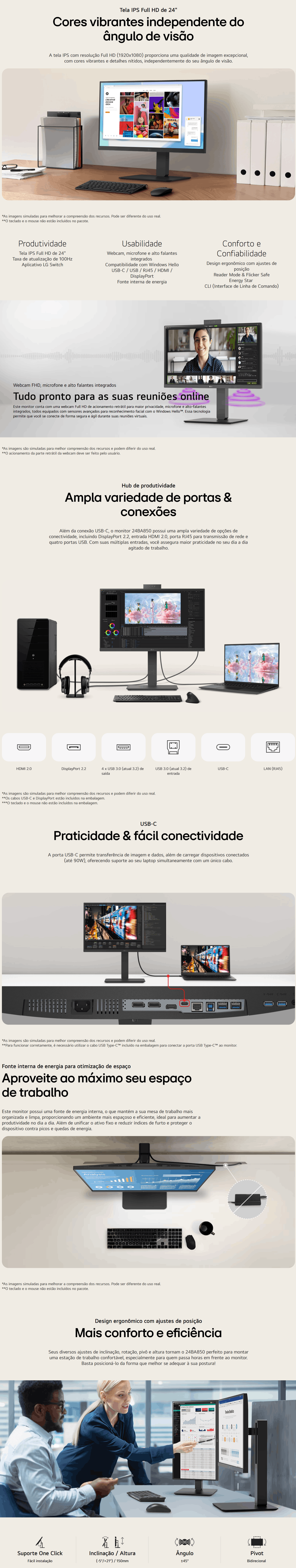 O LG 24BA850-B é uma excelente escolha para quem procura um monitor Full HD IPS de 24 polegadas com recursos corporativos, conectividade avançada e ergonomia completa. É uma solução prática e moderna para produtividade, reuniões online e uso profissional com alto nível de conforto e eficiência.