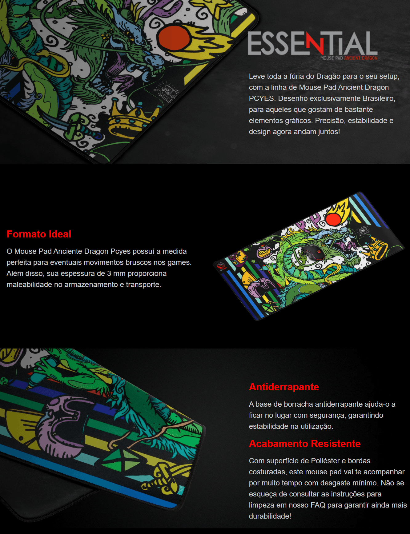 O Mouse Pad Gamer PCYES Ancient Dragon Extended 900 x 420mm foi feito para quem quer máximo espaço, precisão superior e conforto total em sessões de jogos intensos, trabalho criativo ou multitarefa. Com formato extended e área ampla, ele comporta mouse e teclado de forma integrada, proporcionando um visual limpo e espaço otimizado no setup.