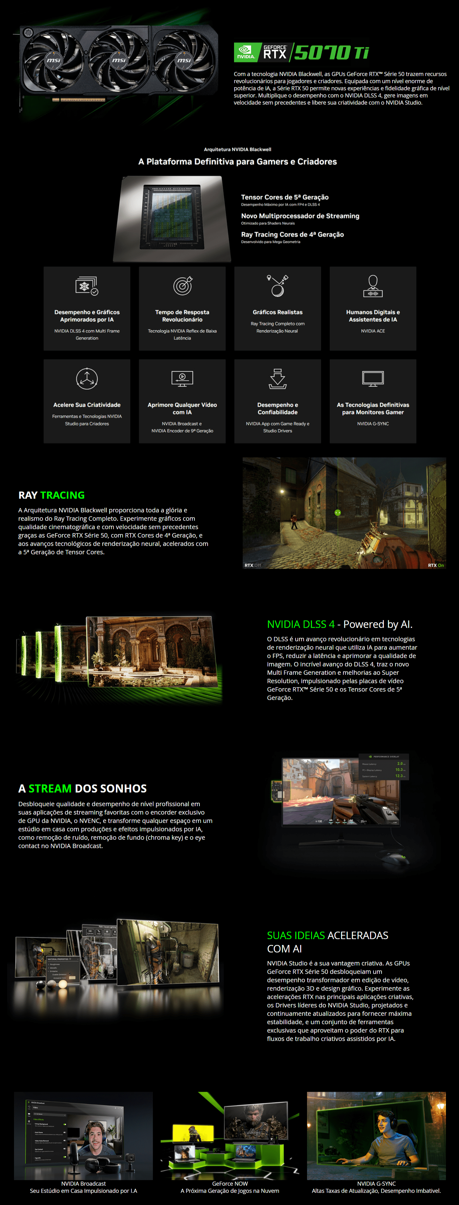 Com a tecnologia NVIDIA Blackwell, as GPUs GeForce RTX™ Série 50 trazem recursos revolucionários para jogadores e criadores. Equipada com um nível enorme de potência de IA, a Série RTX 50 permite novas experiências e fidelidade gráfica de nível superior. Multiplique o desempenho com o NVIDIA DLSS 4, gere imagens em velocidade sem precedentes e libere sua criatividade com o NVIDIA Studio.