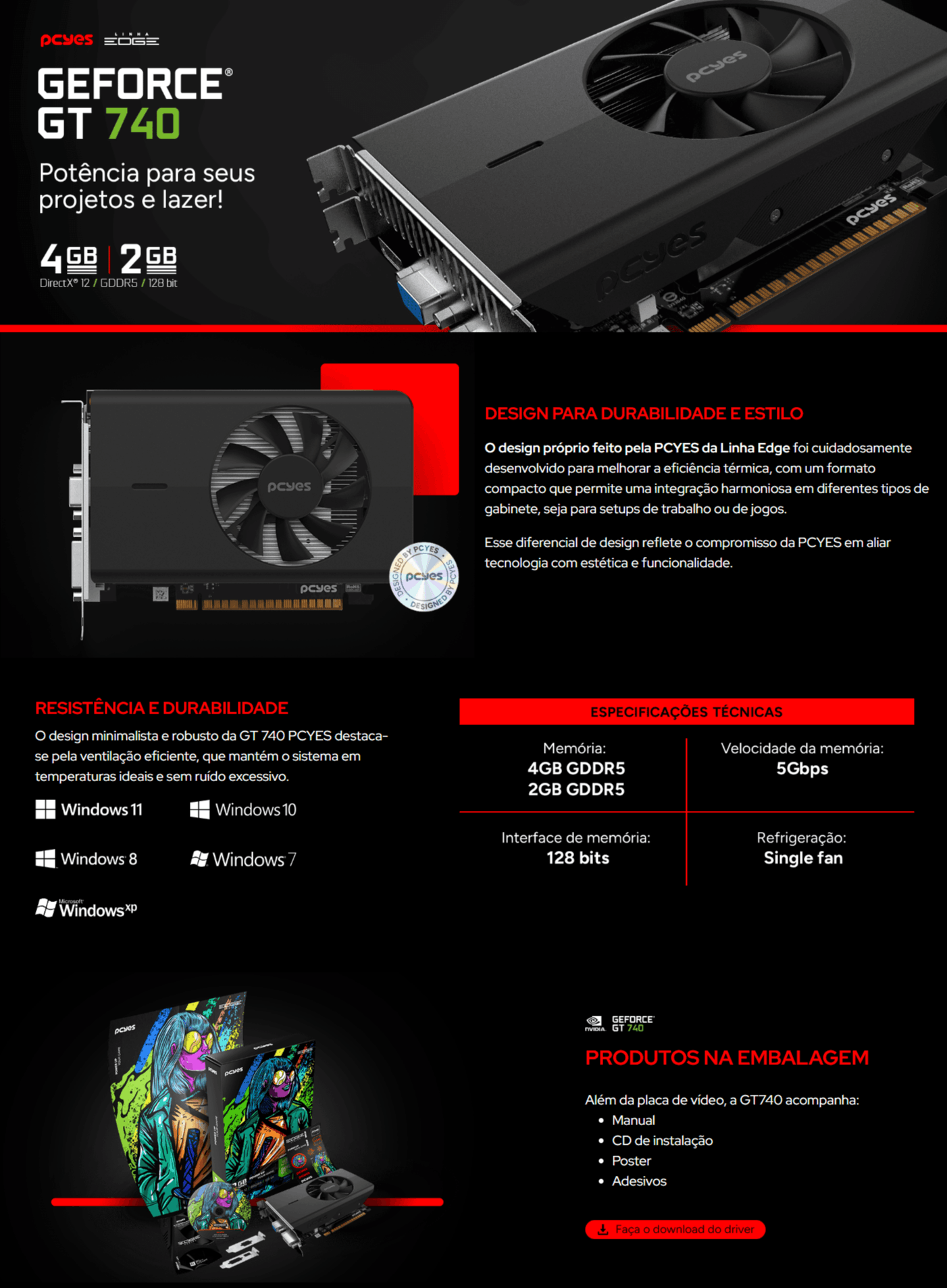 Com memória GDDR5 de 2GB e interface de 128-bit, a GT 740 garante maior largura de banda e resposta mais estável em reprodução de vídeo, navegação e aplicações 3D leves. Seu sistema de refrigeração com ventoinha única (single fan) mantém o funcionamento em temperaturas adequadas com baixo consumo de energia.