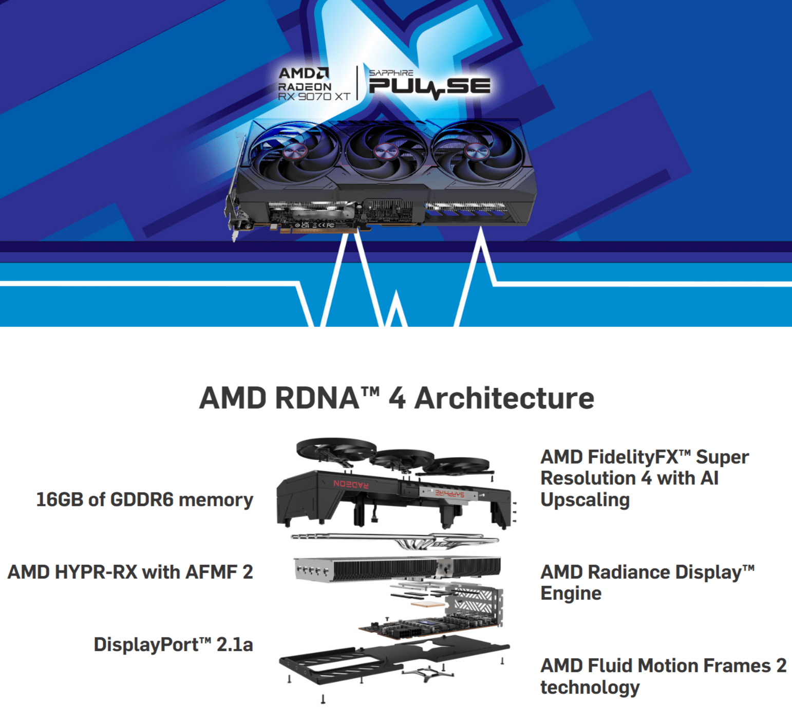 Arquitetura AMD RDNA 4, com 64 Compute Units, aceleradores de RA e IA de 2ª geração.