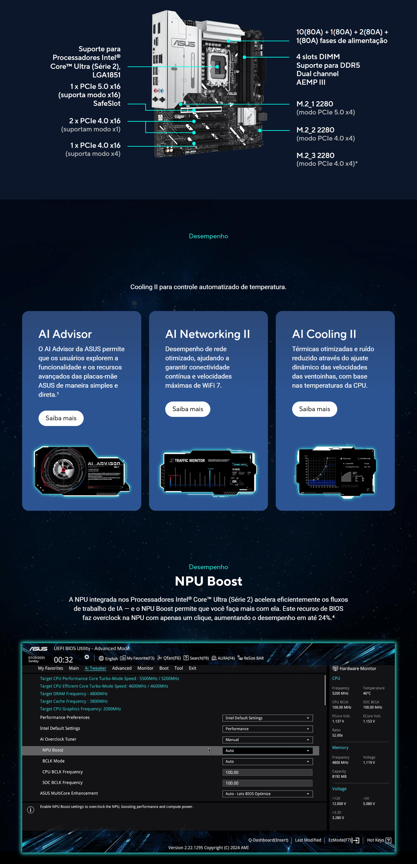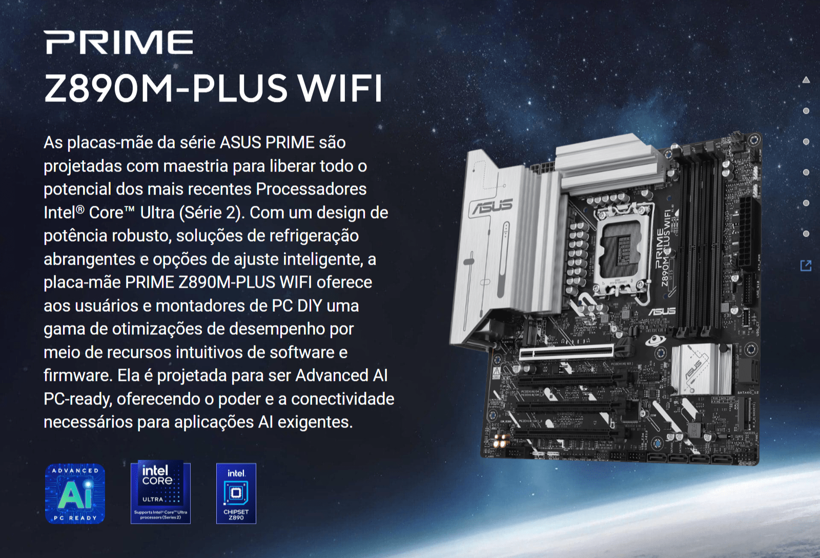 As placas-mãe da série ASUS PRIME são projetadas com maestria para liberar todo o potencial dos mais recentes Processadores Intel® Core™ Ultra (Série 2). Com um design de potência robusto, soluções de refrigeração abrangentes e opções de ajuste inteligente, a placa-mãe PRIME Z890M-PLUS WIFI oferece aos usuários e montadores de PC DIY uma gama de otimizações de desempenho por meio de recursos intuitivos de software e firmware. Ela é projetada para ser Advanced AI PC-ready, oferecendo o poder e a conectividade necessários para aplicações AI exigentes.