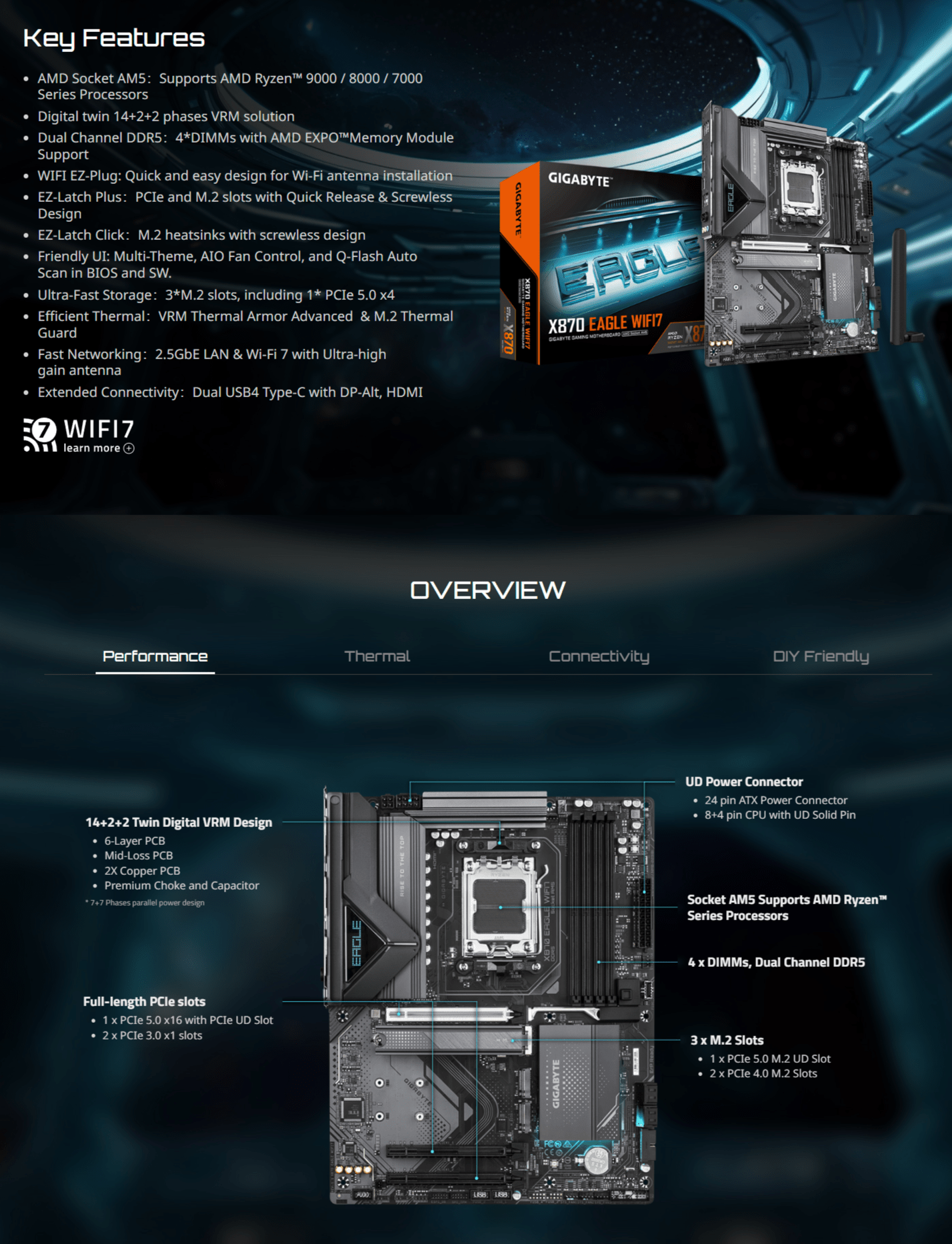 A Gigabyte X870 EAGLE WIFI7 (rev. 1.x) é construída para entusiastas que desejam montar um PC com processador da plataforma AMD AM5, oferecendo qualidade, recursos modernos e estrutura sólida para upgrades futuros.