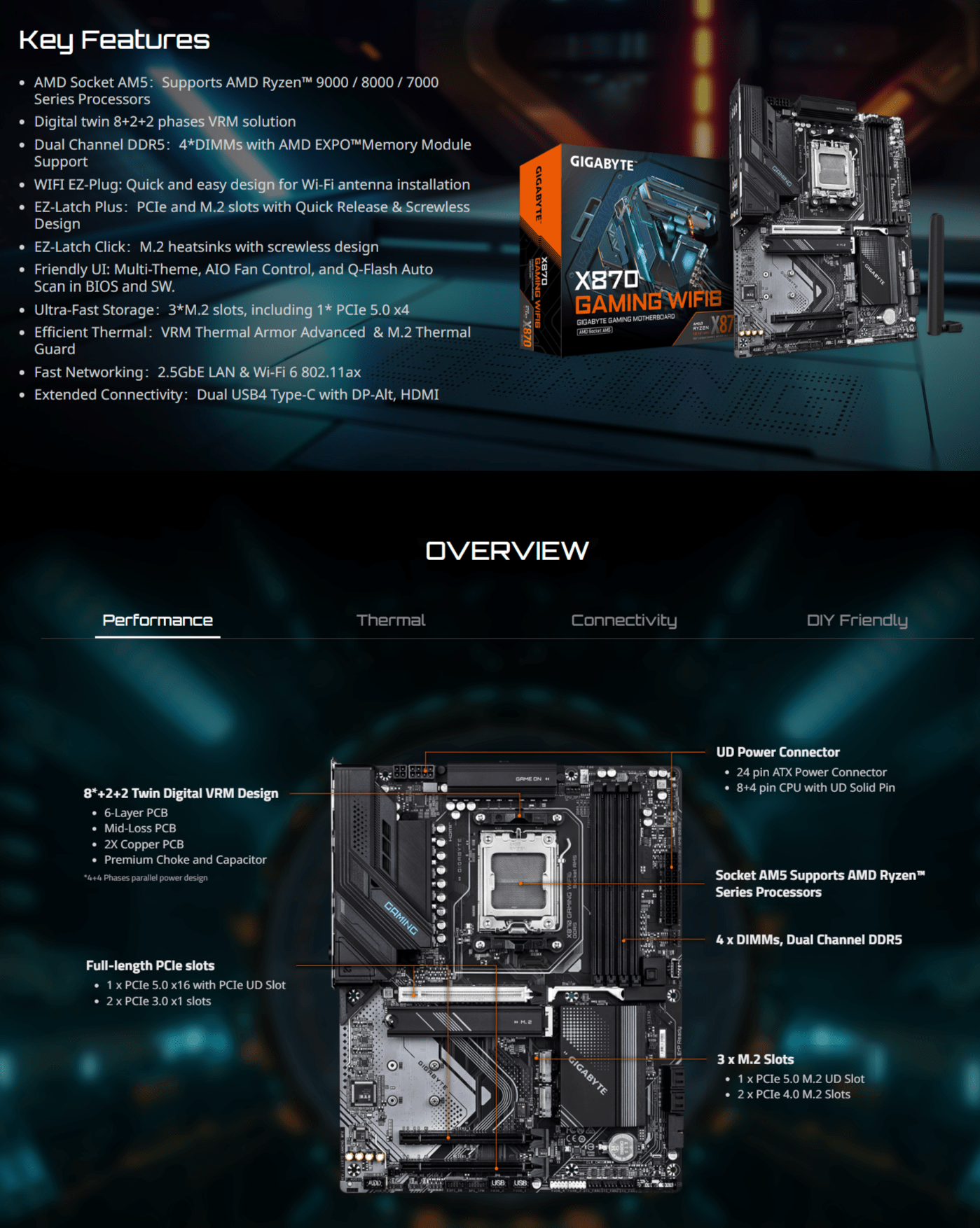 Transforme seu PC em uma máquina pronta para o futuro com a placa-mãe GIGABYTE X870 GAMING WIFI6 (rev. 1.x). Projetada para quem busca desempenho de topo, confiabilidade e tecnologia de última geração.