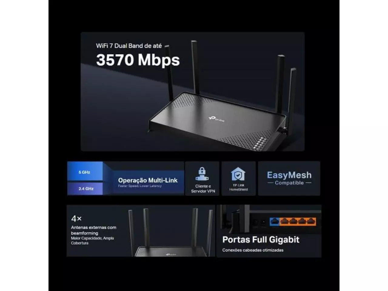 Roteador TP-Link Archer BE220 Wi-Fi 7 Dual Band BE2200, 2.4GHz + 5GHz, EasyMesh, 4 Antenas, Gigabit