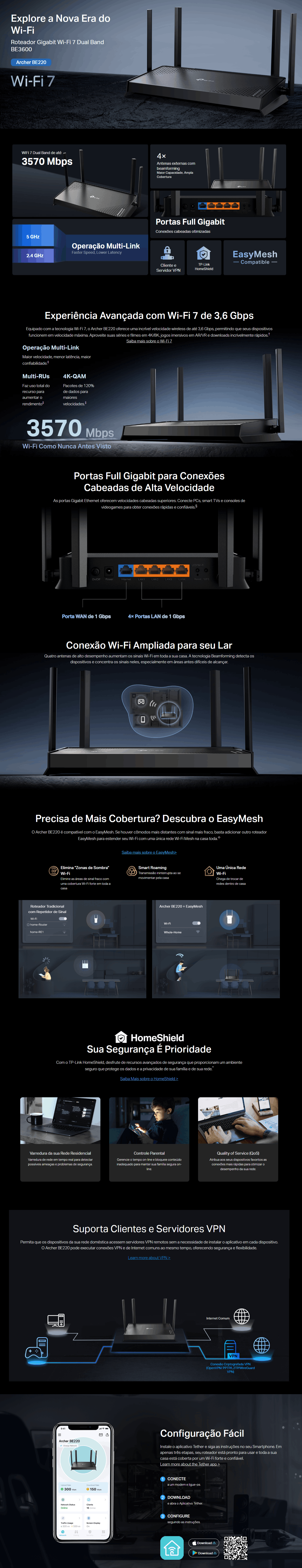 Equipado com tecnologia EasyMesh, o Archer BE220 permite expansão da rede de forma inteligente, eliminando áreas sem sinal. Suas antenas de alto ganho e recursos avançados garantem cobertura estável, enquanto as portas Gigabit oferecem conexões cabeadas de alta velocidade para desktops, consoles e smart TVs.