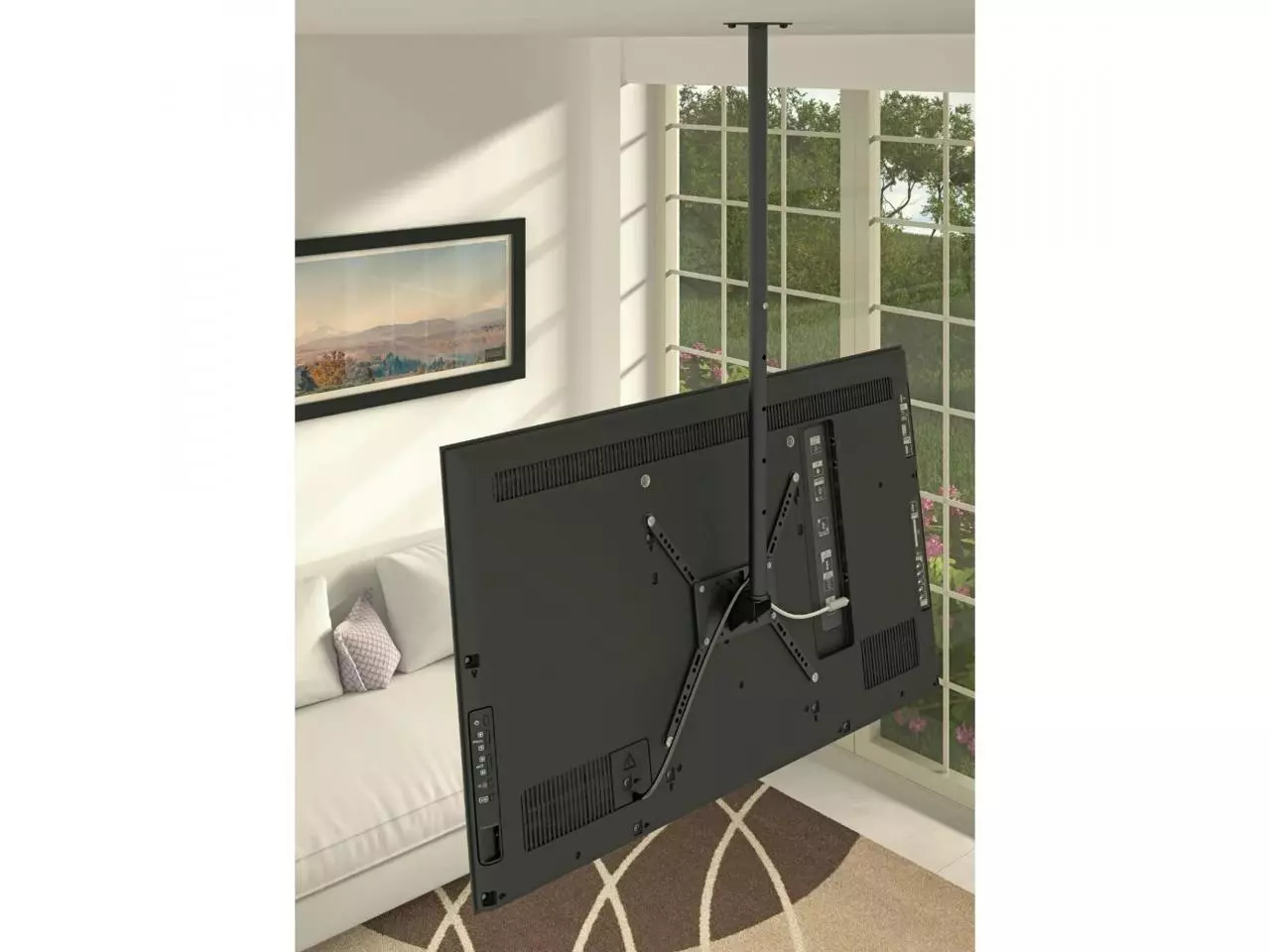 O suporte de teto também oferece ajuste de altura, com uma faixa de altura variando de 750mm a 1.150mm. Com cinco ajustes de altura disponíveis, você pode encontrar a posição ideal para a visualização da TV, levando em consideração a altura do teto e as preferências pessoais. Além disso, o suporte possui um ajuste de nível de 3° / +3°, permitindo ajustar a posição horizontal da TV para garantir um alinhamento perfeito.