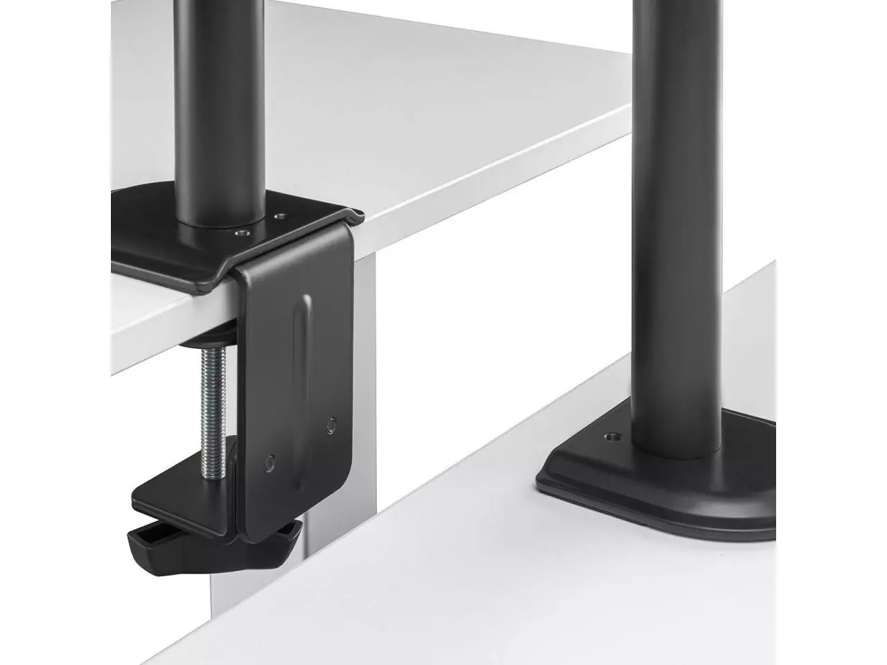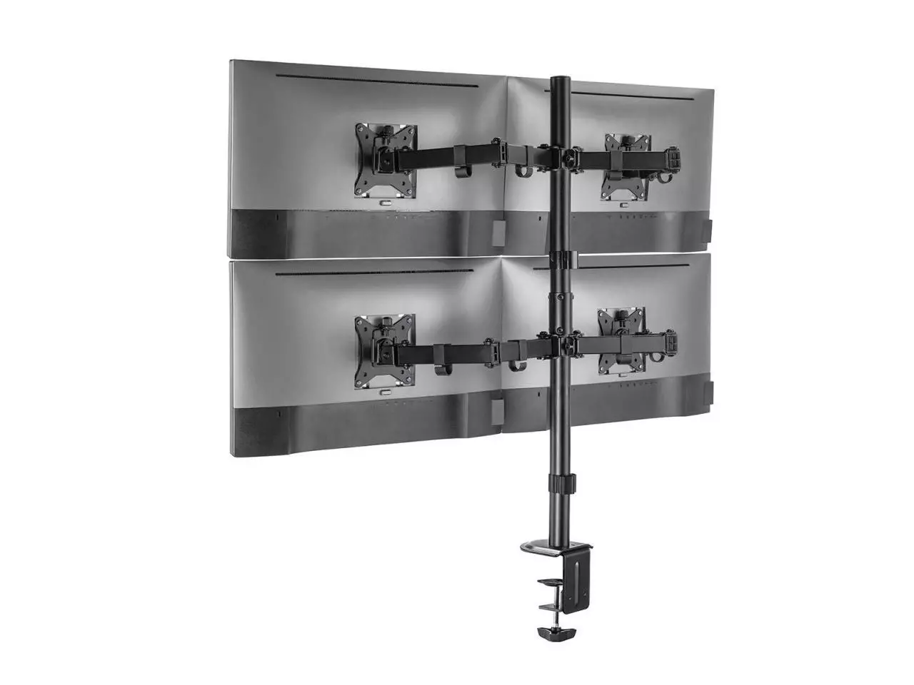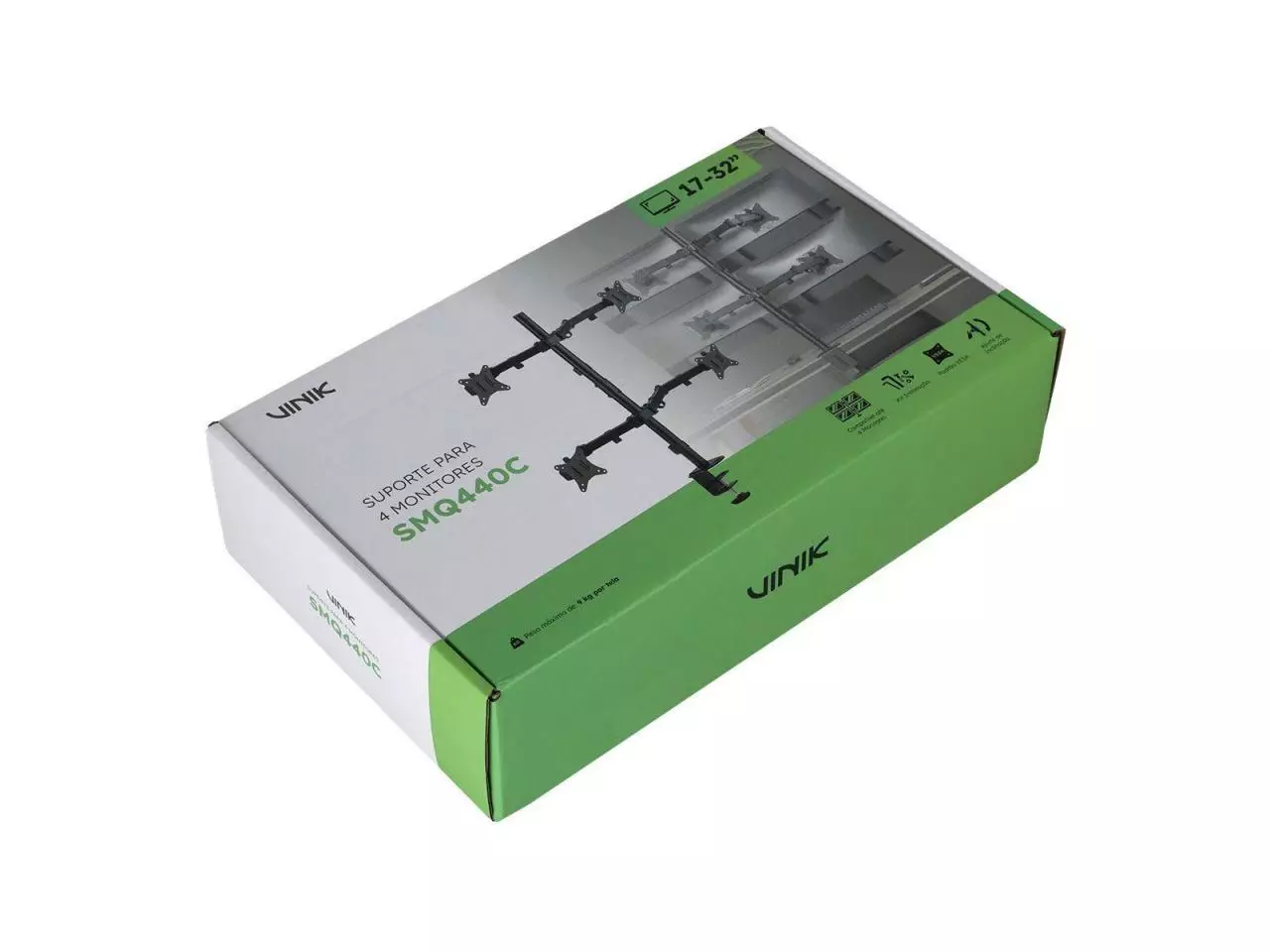 Com uma estrutura de aço durável, este suporte oferece estabilidade para quatro monitores de 17" a 32" de até 9kg por tela. Design flexível para amplo ajuste e ângulos de visão, ajustáveis para orientação retrato ou paisagem.