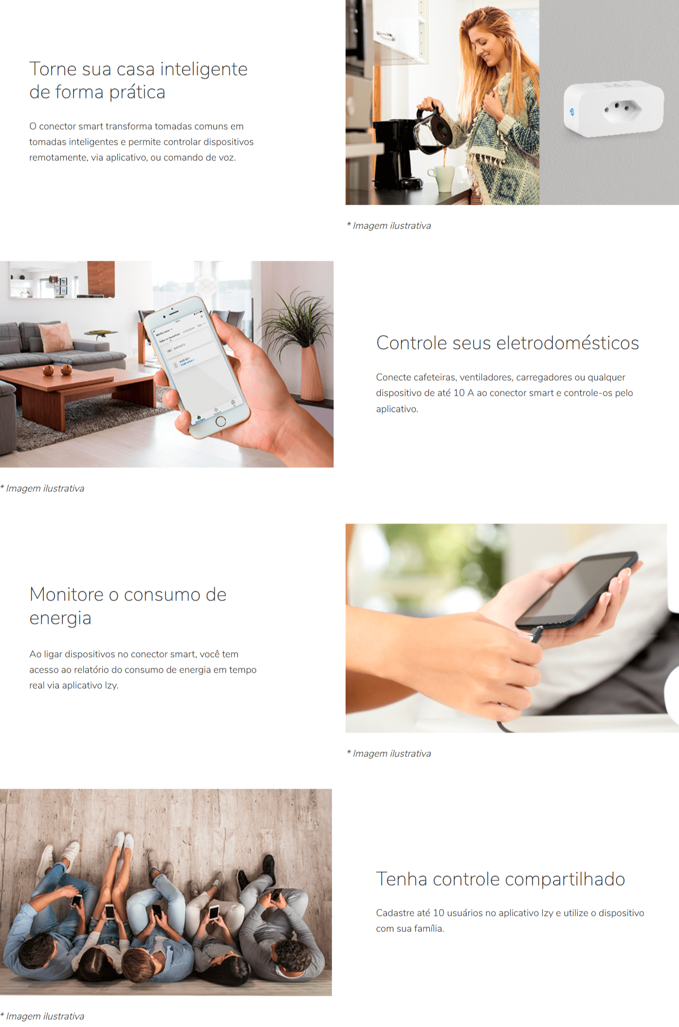 O conector smart transforma tomadas comuns em tomadas inteligentes e permite controlar dispositivos remotamente, via aplicativo, ou comando de voz.